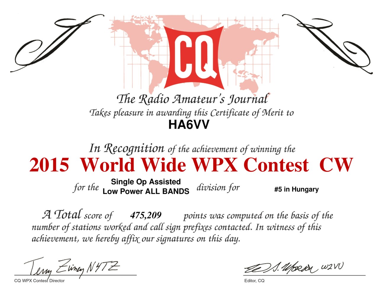 | CQ World-Wide WPX Contest CW | 2015.05.30-31. | HA6VV | 5. hely | ![]() |