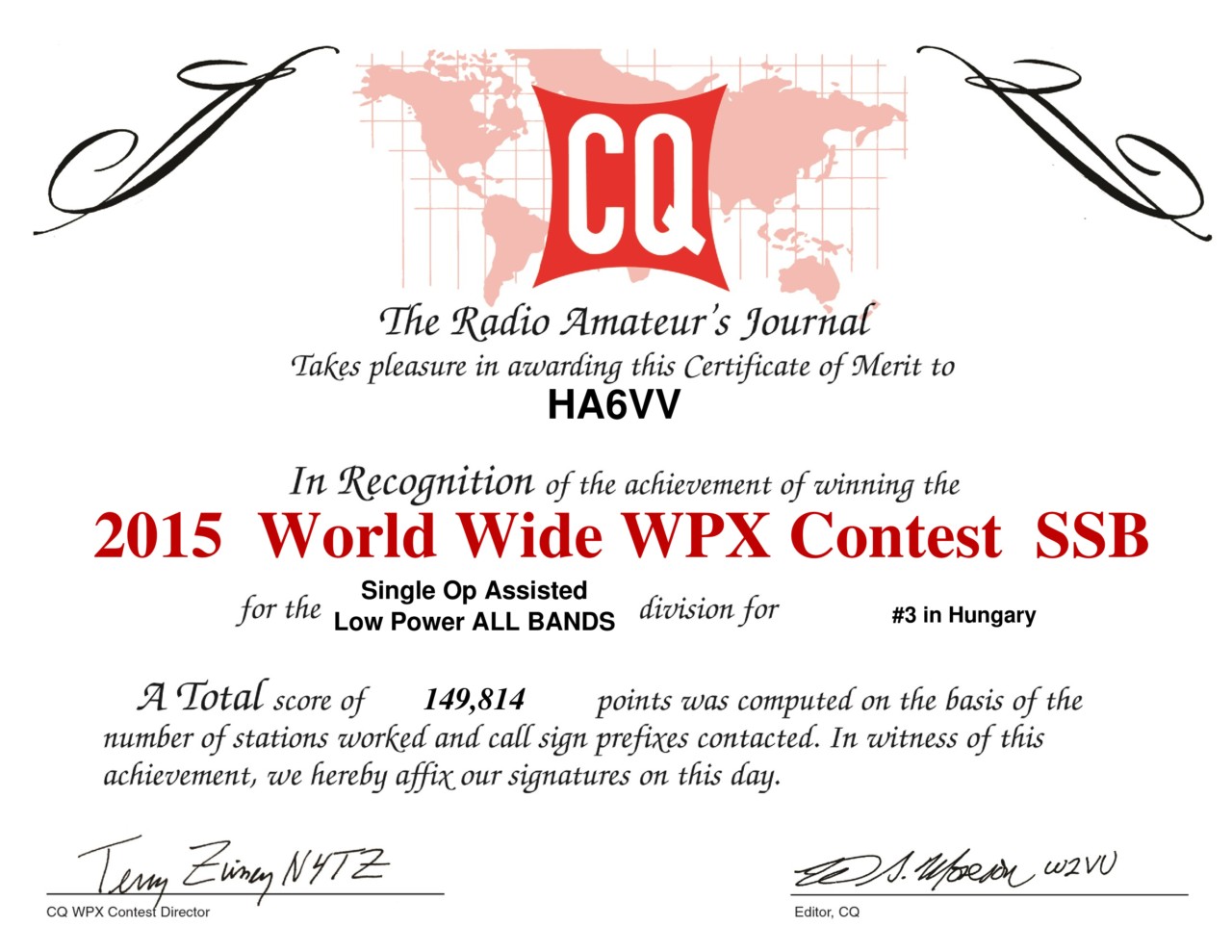 | CQ Word Wide VHF Contest | 2015.07.18-19. | HG6Z | 3. hely | 5. hely | |