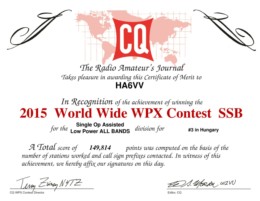 | CQ World-Wide WPX Contest CW | 2015.03.28-29. | HA6VV | 3. hely | ![]() |
