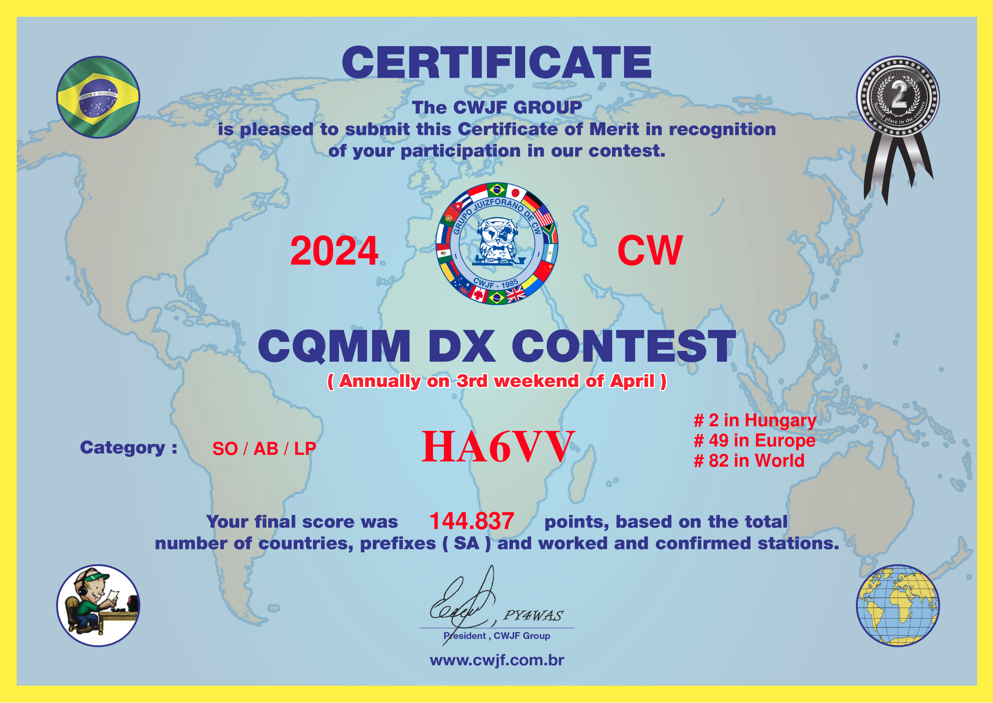 | CQMM DX CONTEST | 2024.04.20-21. | HA6VV | 2. hely | 82. hely | |