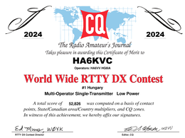 | CQ-WW-RTTY | 2024.09.28-29. | HA6KVC | 1. hely | 21. hely | |