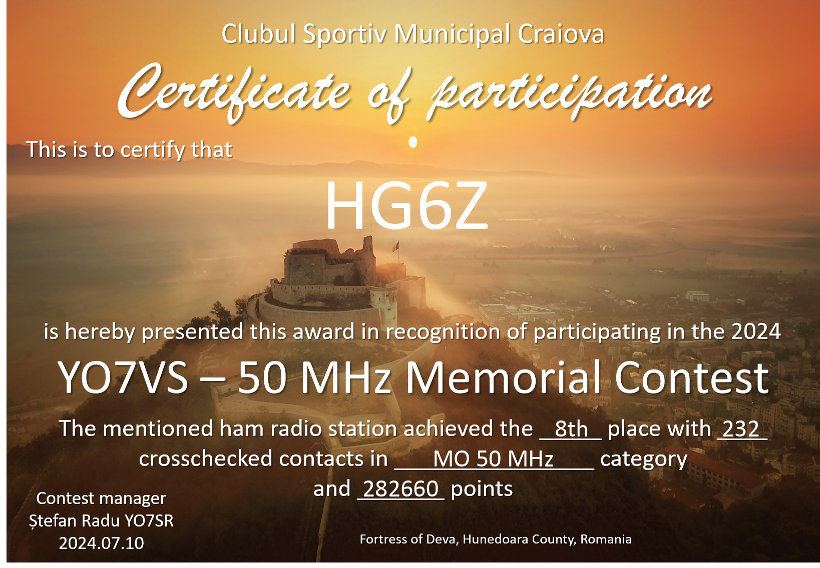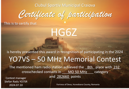 | YO7VS Memorial 50 MHz | 2024.06.15-16. | HG6Z | 8. hely | |