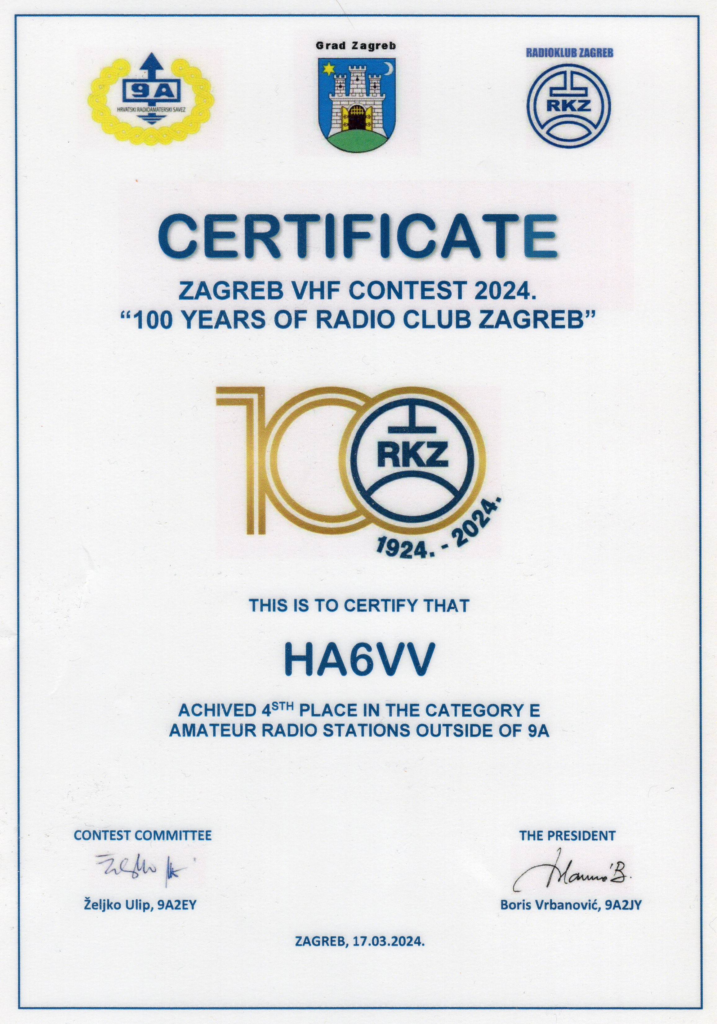 | Zagreb VHF Contest | 2024.03.17. | HA6VV | 4. hely | |