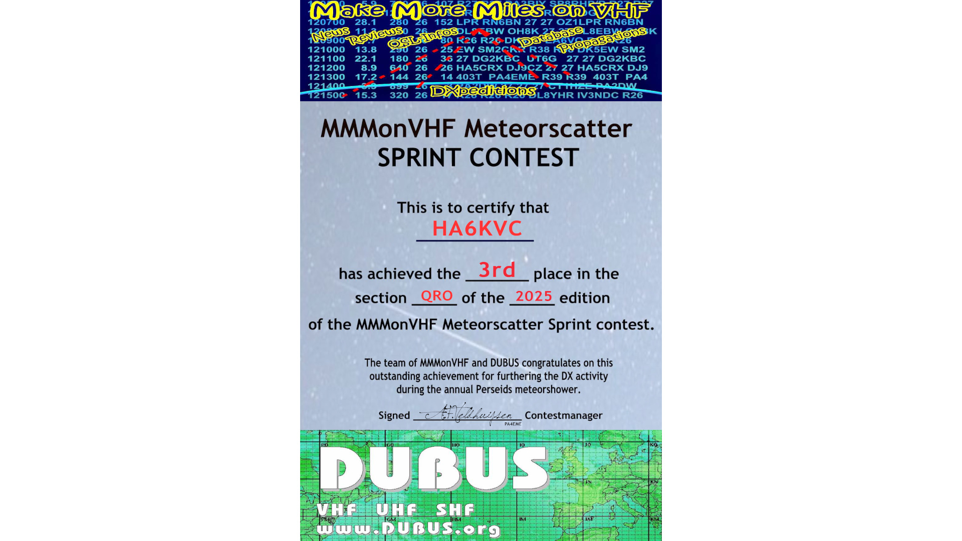 | Meteor Scatter Sprint | 2025.08.11-13. | HA6KVC | 3. hely | |